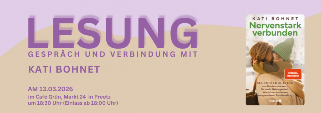 Kati Bohnet liest in gemütlicher Atmosphäre im Café Grün aus ihrem Spiegel-Bestseller “Nervenstark verbunden”. Ein wundervolles und warmherziges Buch, in dem die Autorin mit Blick auf die Funktionsweise des Nervensystems sehr wohlwollend Möglichkeiten aufzeigt, wie wir herausforderndes Verhalten von Kindern besser verstehen und entspannter begleiten können. In diesem Buch finden sich fachlich fundierte, alltagstaugliche und sehr wertschätzend dargestellte Strategien und es macht vor Allem auch Mut: